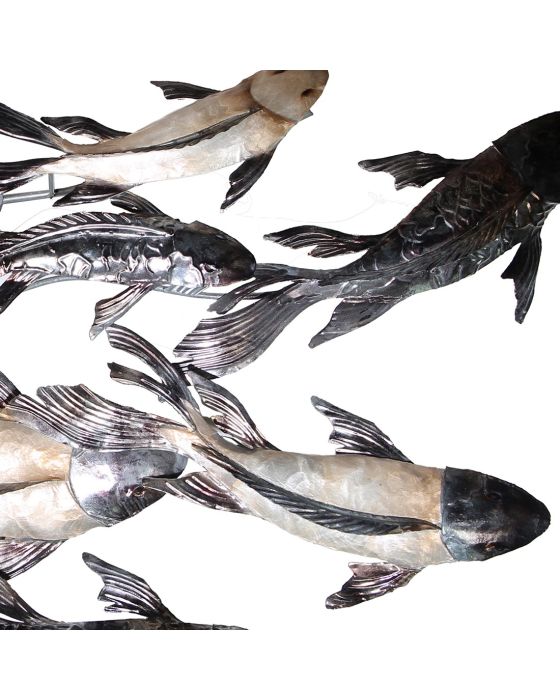 Bring the serene beauty of the coast into your home with this exquisite handcrafted Capiz & Metal White Elegance Koi Wall Decor Wall Art. Eight intricately detailed koi fish, rendered in a stunning blend of shimmering silver and creamy off-white, appear to gracefully swim across your wall. Each fish is meticulously crafted, showcasing the artist's skill in capturing the fluid movement and elegance of these aquatic creatures. The contrasting metallic finishes add a touch of modern sophistication to this timeless design. This captivating piece effortlessly blends natural coastal themes with contemporary artistry, making it a perfect piece for any living space, bedroom, or office. Transform your walls into an underwater oasis with this breathtaking handmade wall art from The Seashell Company.