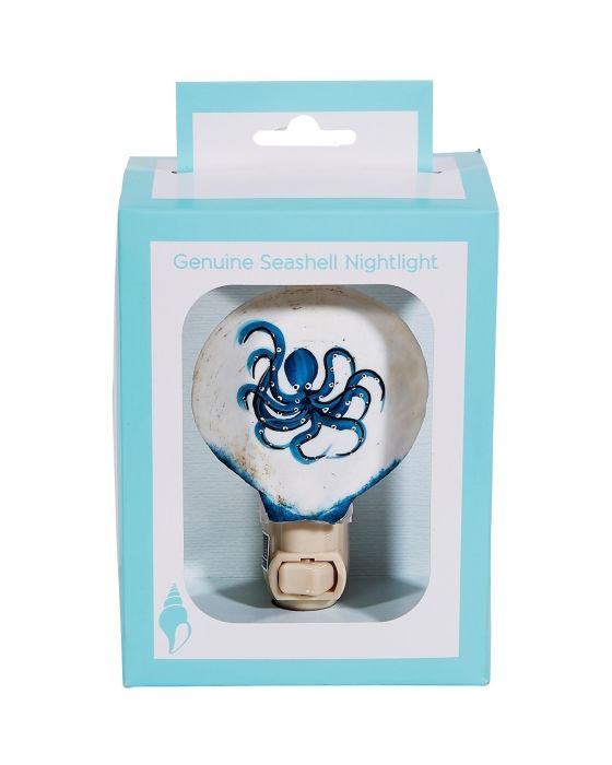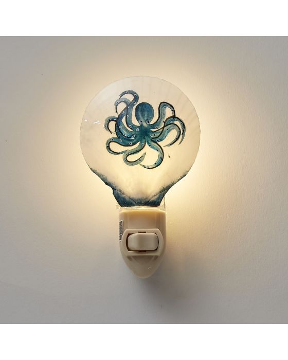 Dive into tranquility with this exquisite Painted Octopus LED Night Light. Hand-painted on a moon shell, a captivating blue octopus takes center stage, its elegant tentacles gracefully swirling across the white surface. The gentle glow emanating from within casts a mesmerizing aura, transforming any room into a serene ocean sanctuary. Perfect for bedrooms, bathrooms, or children's spaces, this charming piece adds a touch of nautical artistry and calming ambiance. Its compact size and plug-in convenience make it an ideal addition to any home decor, providing soft illumination while adding a unique, handcrafted charm to your coastal-inspired living space. A perfect gift for ocean lovers or anyone seeking a touch of seaside magic. LED bulb is rated for 25,000 hours of use.