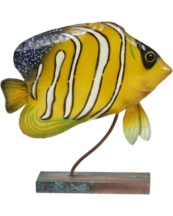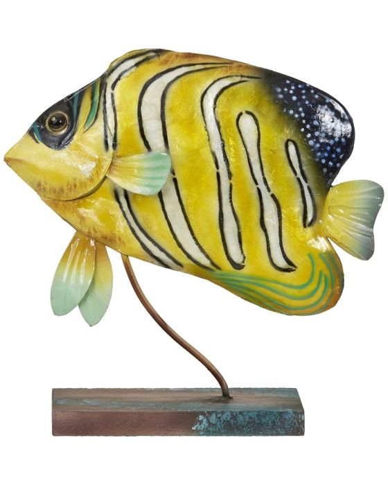 Transform your home into a seaside paradise with our Capiz & Metal Art Royal Angelfish on Stand. Handcrafted with intricate details, this stunning piece features a vibrant yellow and white color scheme that will brighten up any space. Made from high-quality materials, this angelfish is not only beautiful but also durable. Perfect for coastal and nautical themed decor, this piece will add a touch of charm and whimsy to your home. Display it on a shelf, mantel, or table to instantly elevate your decor. Add this unique and eye-catching piece to your collection today!