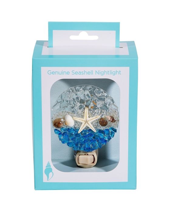 Bring the serene beauty of the coast into your home with this Sea, Sand, & Sky Round Boxed LED Night Light. Handcrafted with care, this unique piece features a captivating blend of crushed glass in a soft, translucent white, accented by vibrant teal sea glass pieces at the base. Three delicately placed seashells – a pearly cockle, a lustrous mussel, and a tiny spiral – rest amongst the glass, complemented by a starfish at the heart. The warm, gentle glow emanating from within creates a magical ambiance, transforming any room into a coastal haven. Perfect for bedrooms, bathrooms, or children’s rooms. Add a touch of seaside charm to your décor and let the calming light guide you to peaceful slumber. LED bulb is rated for 25,000 hours of use.