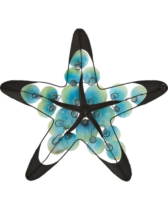 Invite this bright and beautiful starfish into your home! At 19" it is a stunning metal and natural shell wall piece in bright greens and blues that is sure to bring cheer to any room. Twenty (20) Capiz shells create dimension and depth, and don't miss the smaller starfish in the center!