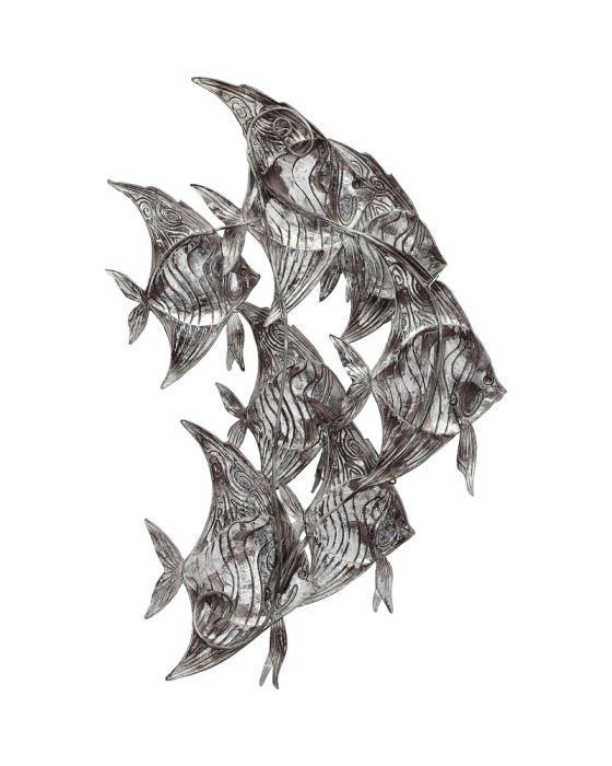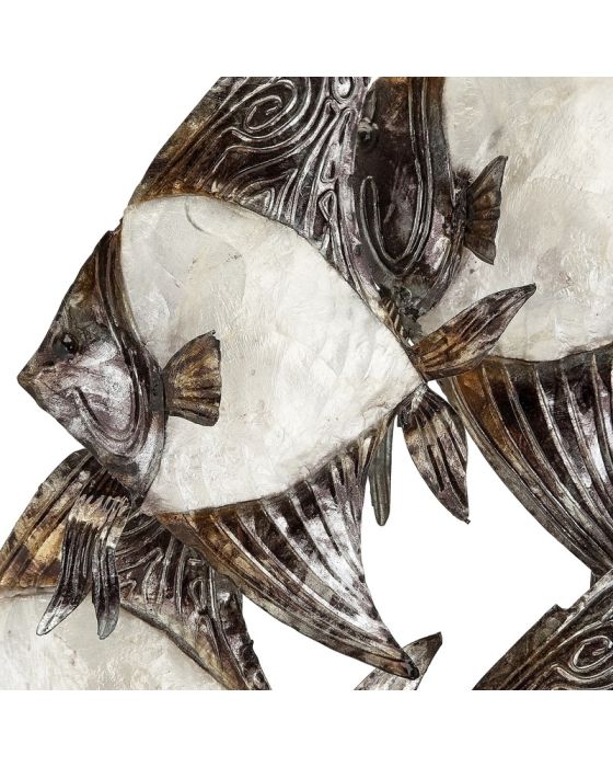 This school of Capiz Banner Fish will delight all ages, as seven (7) fish swimming in formation are headed... somewhere! Steel and bronze-toned metal surround the ivory bodies and black eyes of the Capiz inlaid fish. At a sizeable 24" x 15", this wall decor will add depth to any office or home -- great for rooms, hallways, patios or balconies!!